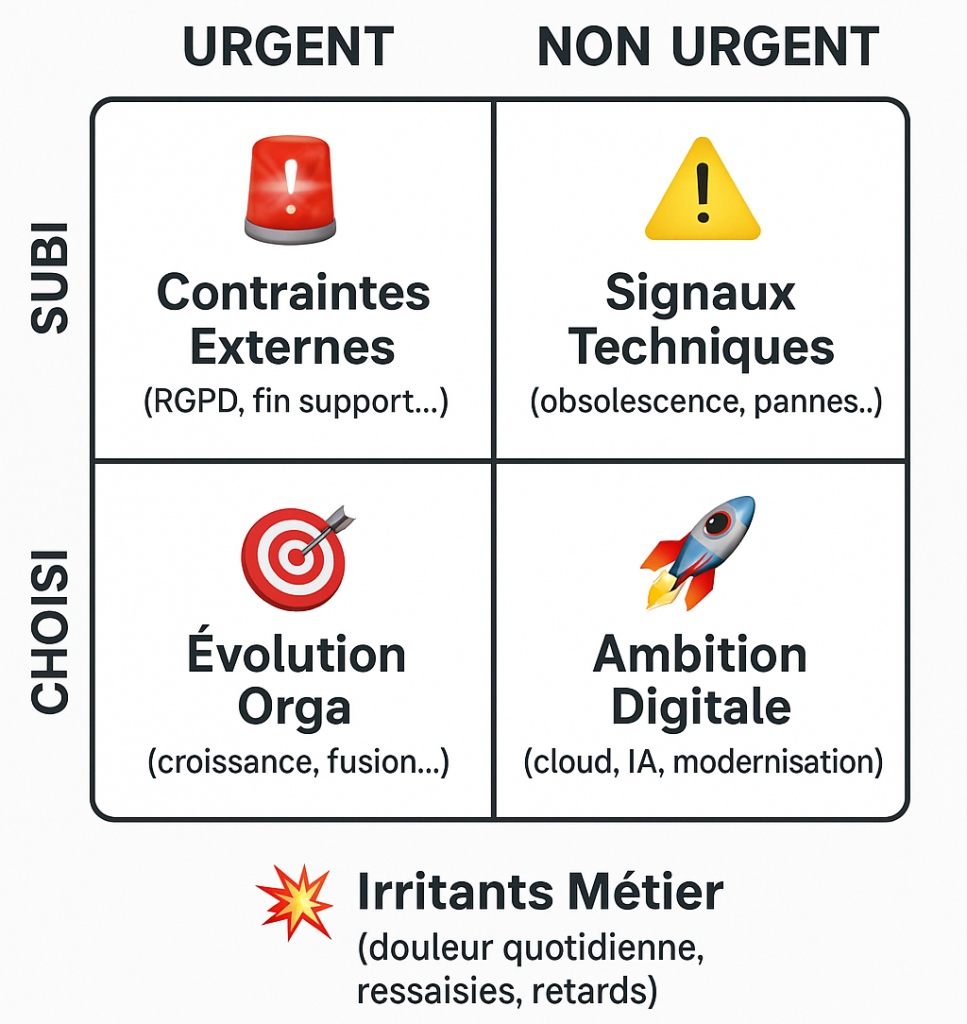 Votre entreprise a-t-elle besoin d’un ERP ? 5 indices qui ne trompent pas Vous vous demandez si votre système actuel suit encore le rythme de votre entreprise ? Vous avez le sentiment que vos outils freinent plus qu’ils n’accélèrent vos opérations ? Vous voulez assurer l’étape cruciale de la prise de conscience avant de vous lancer dans un projet structurant ?Cette phase correspond au premier jalon de la méthodologie PRISM : « Déclencheur et Opportunité », où l’on identifie les signaux faibles et les douleurs métiers qui annoncent qu’un changement devient nécessaire.Dans cet article, découvrez comment reconnaître les 5 catégories de signaux qui indiquent qu’il est temps de se poser sérieusement la question d’un ERP, et pourquoi agir au bon moment peut transformer ces irritants en véritables leviers de croissance. L’essentielLes signaux faibles ne mentent pas : La majorité des entreprises constatent une amélioration significative après l’implémentation d’un ERP, mais seulement si elles ont su identifier le bon moment pour se lancerLe coût de l’inaction : Attendre trop longtemps coûte cher – plusieurs études montrent que les entreprises perdent considérablement en efficacité opérationnelle quand leurs outils deviennent obsolètesUne opportunité déguisée : Chaque irritant quotidien représente un potentiel de transformation et un avantage concurrentiel à saisir pour les entreprises qui osent franchir le cap Les 5 catégories de déclencheurs à surveiller1. Les signaux techniques et systémiquesCes premiers alertes concernent l’infrastructure et la fiabilité de vos outils actuels :Symptômes observés :• Systèmes obsolètes (ERP >10 ans, Windows Server 2012, bases Access)• Dépendances techniques critiques (seul Gérard maîtrise le paramétrage)• Pannes récurrentes et temps d’arrêt fréquents (>5h/mois d’indisponibilité)• Failles de reporting et données peu fiables (écarts stock >10%)• Surcoûts opérationnels liés à la maintenance (>60% du budget IT) Exemple concret Western Digital, suite à sa fusion avec SanDisk, a choisi Oracle ERP Cloud pour remplacer ses systèmes disparates et centraliser ses opérations mondiales. Attention : De nombreux projets ERP sont déclenchés par l’obsolescence technologique. Ne pas anticiper peut vous mettre en situation de crise. 2. Les irritants métier quotidiensCes frustrations remontent directement du terrain et impactent la productivité :Les plus fréquents :Retards systémiques dans les processus (clôture comptable >10 jours, facturation différée)Ressaisies multiples des mêmes données (client saisie CRM + ERP + compta)Erreurs en cascade dues au manque de synchronisation (stock théorique ≠ réel)Dépendance excessive à Excel et aux fichiers partagés (pilotage sur tableaux de bord Excel)Silos entre services qui compliquent la collaboration (commercial ignore les stocks) Statistique clé La majorité des entreprises observent une amélioration immédiate de leurs performances opérationnelles après avoir éliminé ces irritants via un ERP. N’oubliez pas : Ces « petits » problèmes quotidiens représentent souvent des pertes de temps importantes pour vos équipes. 3. L’évolution organisationnelleCertains événements structurants remettent naturellement en question l’efficacité de vos outils :Déclencheurs stratégiques : • Croissance rapide : CA doublé en 2 ans mais les outils restent les mêmes • Nouvelles filiales ou ouverture de sites (multi-établissements, consolidation) • Fusion/acquisition nécessitant l’harmonisation (2 ERP différents à unifier) • Internationalisation avec besoins spécifiques (multi-devises, TVA locale, langues) • Nouvelle direction IT ou changement d’actionnariat (audit des systèmes) Mémo technique La règle des « paliers de croissance » : souvent, un système qui convient à 50 collaborateurs montre ses limites à 100, puis devient critique à 200. 4. Les contraintes externes et réglementairesL’environnement évolue et impose parfois le changement :Facteurs externes :• Fin de support d’un logiciel critique (fin de support Windows, Oracle, SAP R/3)• Nouvelles normes comptables ou fiscales (IFRS 16, DSN, TVA intracommunautaire)• Exigences de cybersécurité renforcées (NIS2, ISO 27001, audit ANSSI)• Dématérialisation obligatoire (e-invoicing, Chorus Pro, Peppol)• Conformité RGPD et protection des données (droit à l’oubli, portabilité)Pression concurrentielle :• Vos concurrents digitalisent leurs processus (e-commerce B2B, API clients)• Vos clients exigent plus de réactivité (devis en 24h, suivi temps réel)• Le marché impose de nouveaux standards (EDI, portails fournisseurs, traçabilité) Technique Pour évaluer l’urgence réglementaire, posez-vous cette question : (Délai imposé – Temps de projet) = Marge de manœuvre. Si le résultat est serré, vous devez agir rapidement. 5. L’ambition de transformation digitaleParfois, c’est une vision qui déclenche la réflexion :Ambitions stratégiques :• Modernisation pour attirer les talents (interface mobile, UX moderne)• Passage au cloud pour plus d’agilité (SaaS, télétravail, scalabilité)• Automatisation pour réduire les coûts (workflows, validation automatique)• Pilotage temps réel pour améliorer la réactivité (KPI live, alertes)• Transformation numérique globale (IA, IoT, dématérialisation complète) Exemple inspirant Une PME manufacturière a considérablement réduit ses stocks excédentaires et ses temps d’arrêt machine en implémentant un ERP avec modules de prévision intégrés. Schéma proposé : « La Matrice des Déclencheurs ERP » Cette matrice vous aide à positionner vos déclencheurs selon leur urgence et leur origine (subis vs choisis) pour prioriser votre prise de décision. Passez du ressenti à la conviction Vous reconnaissez votre situation dans plusieurs de ces sig